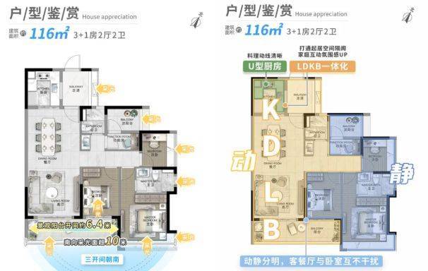 116㎡ 3+1房2厅2卫(横厅):U字型布局厨房,环绕式操作空间,四开间南向采光,超大方厅,客厅与卧室分开布置。