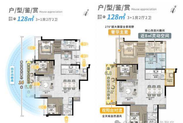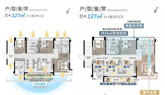 127㎡ 3+1房2厅2卫(横厅):四开间南向采光,大面宽南向大横厅,多种模式切换,双面景观阳台+满飘窗。