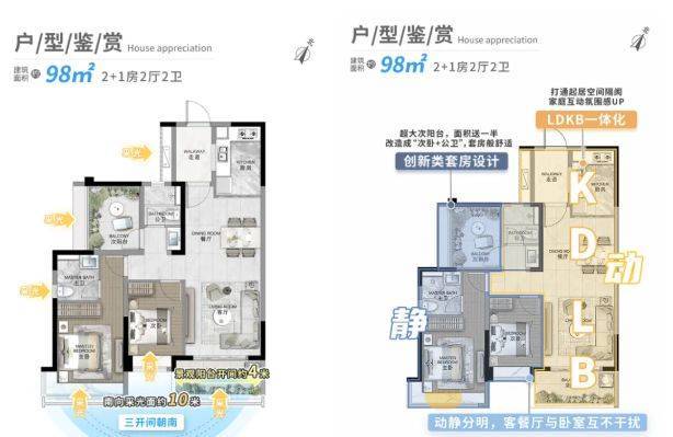98㎡ 2+1房2厅2卫:豪华主卧套房,超大270°转角飘窗,三开间南向采光,超大方厅,动静分明。