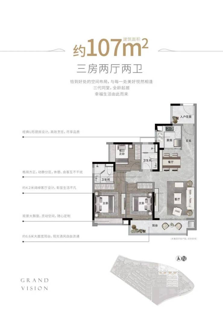 户型方正,动静分区,三开间朝南,采光通风良好;客厅连接景观阳台,视野开阔;主卧套房设计,配备独立卫生间和衣帽间,居住舒适。