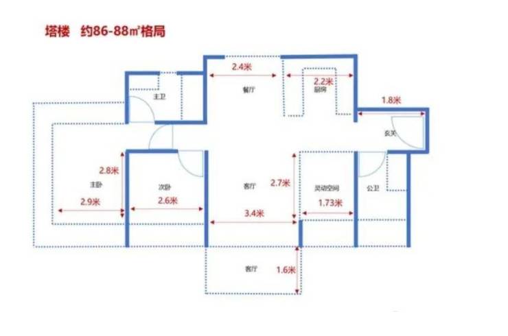 86 平方米三房同样为塔楼 2 梯 5 户配置,做到南北通透,配备 6 米宽景阳台,主卧带飘窗,采光和通风效果突出,空间利用率在同面积段中表现较好。