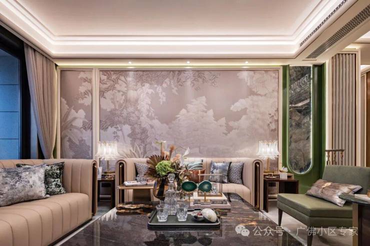 ✨客厅背景墙为阿玛尼底材刺绣墙艺,营造清雅美学。