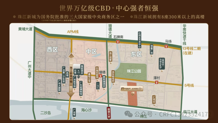 珠江新城为国务院批复三大国家级 CBD 之一(与北京 CBD、上海陆家嘴同级),大湾区独一份,踞天河 / 越秀 / 海珠三区交汇,界定广州城市核心版图;作为广州新中轴线核心,北接燕岭公园、南抵南海心沙岛,串联城市核心地标,随广州发展回归中心,新中轴价值持续跃升。