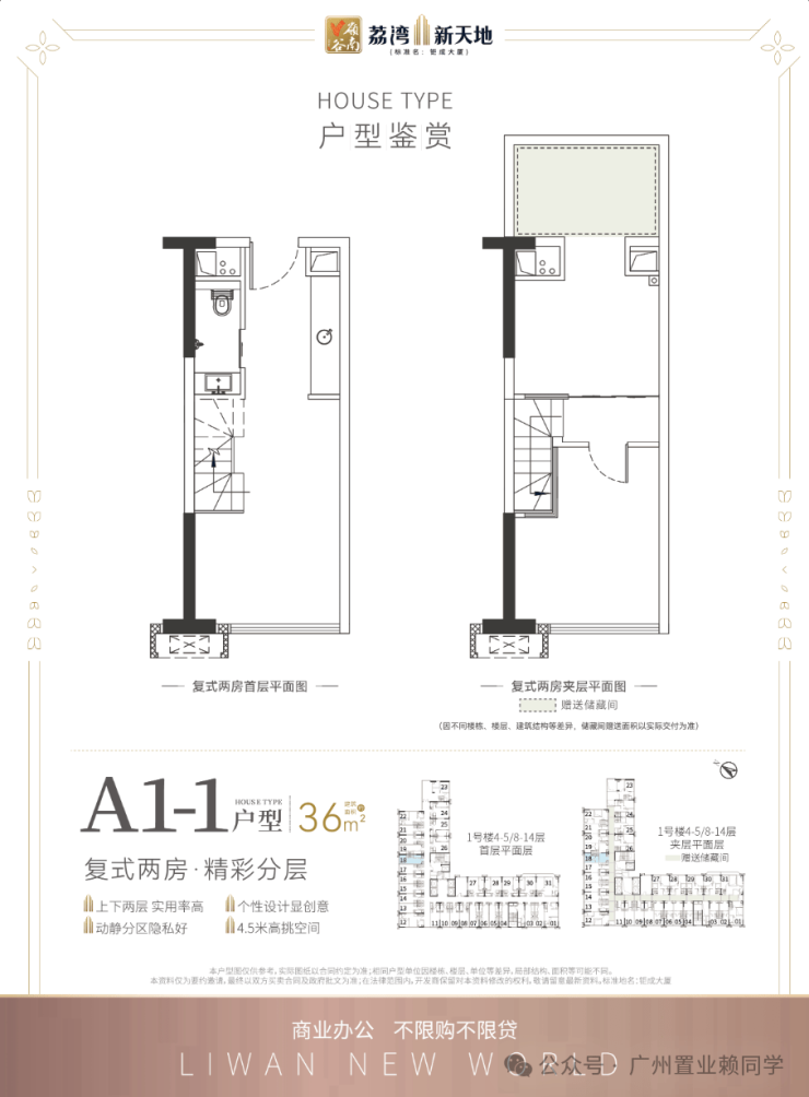 4.5米复式挑高,买一层用两层,高赠送高拓展空间!部分可明火、带阳台、全明房!投资租赁、自用自营、创业办公等,一套全能!