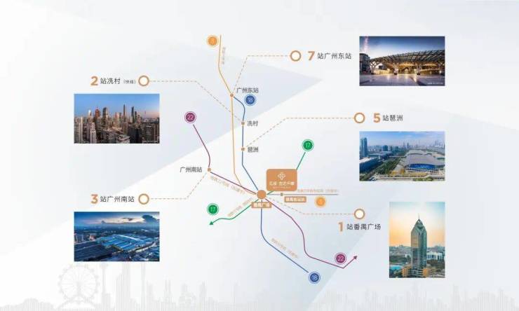 项目位于广州中轴上,番禺城央,3号线延长线番禺客运站上盖,一站番禺广场,坐享5轨交汇城市轨道交通,快速串联区府核心、万博CBD、琶洲CBD、珠江新城等核心主城区。
