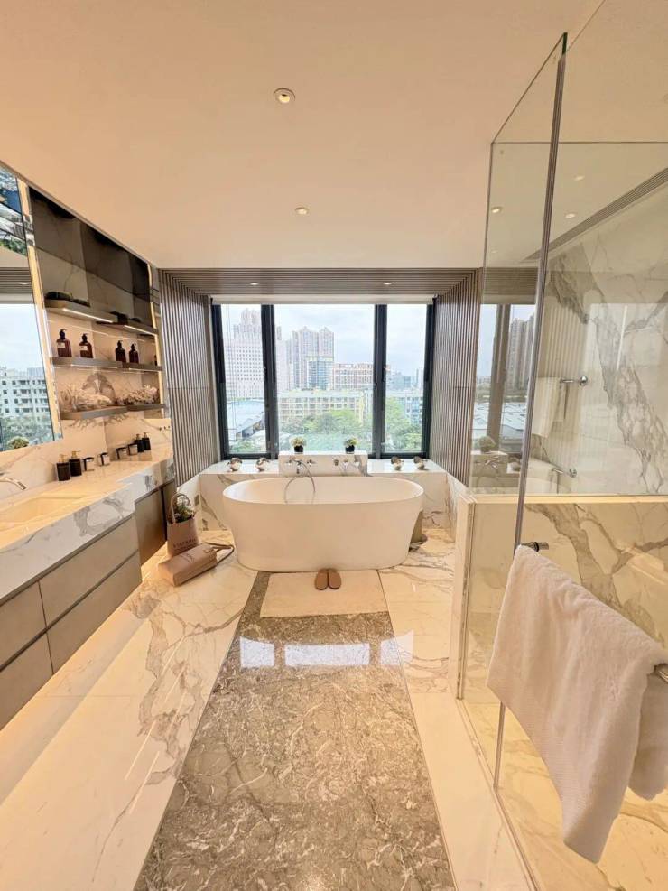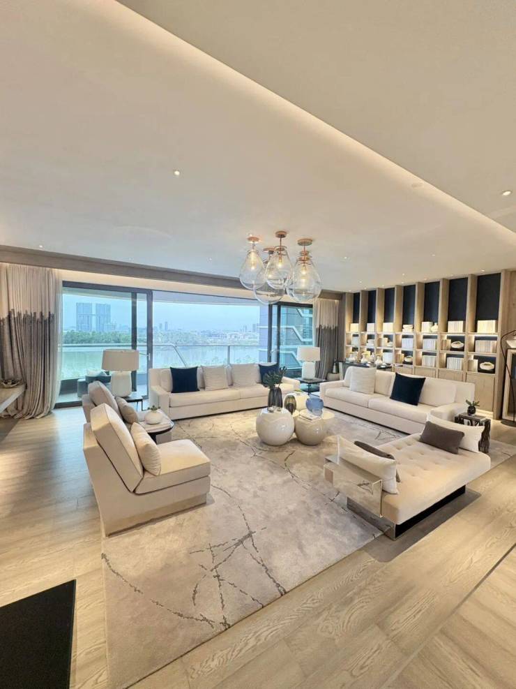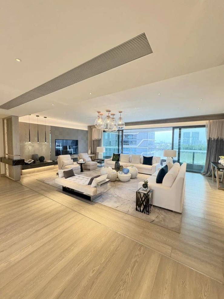 臻溋名铸A3栋368m²住宅大平层,兼具园景和江景视野,拥有超21米的巨幕观景面,搭配超8.5米的弧形大阳台,让推窗见景成为日常。整个室内设计,不浮夸,内敛低调,更符合塔尖人群的挑剔阳光,在过于追求纸面数据所体现空间尺度的当下,你会发现,臻溋名铸才是你最终的选择。