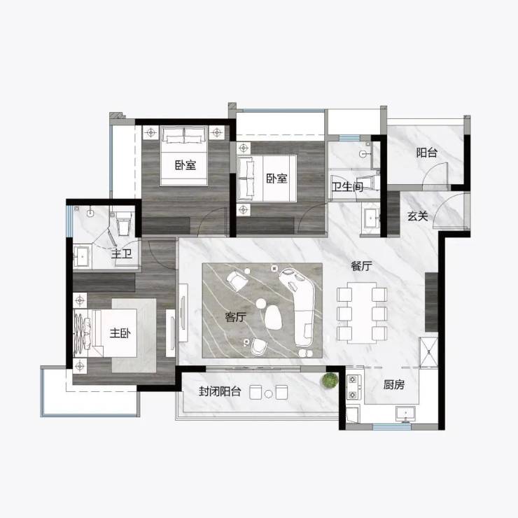 121㎡ 3+1房2厅2卫,L型入户尊崇体验,约8.1m长南北通透都荟宽厅,约5m长270°观景阳台,约46㎡豪宅式社交空间。