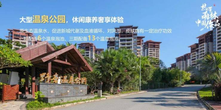 七仙岭的温泉闻名遐迩,是全海南岛最大的温泉之一,出水温度最高可达93℃,温泉水质属于偏硅酸重酸钠型,具有美容养颜、保健养生的功效。对于风湿性关节炎、痛风、心血管疾病、皮肤病都有不错的疗养功效。项目概况:项目概述:项目总占地2000亩,分三期开发,占地500亩,一期均全部已售罄总建面:10万方绿化率:35%车位比:3:1在售:二期68.3亩,包含康养公寓、花园洋房、联排别墅、双拼别墅;三期101亩,包含高层、湖景洋房产品类型:小高层住宅、洋房、商铺、康养公寓