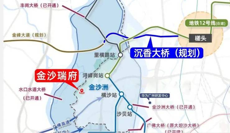 >金沙洲大桥、大坦沙大桥、沉香大桥(规划)、同心桥(在建)、水道口大桥、黄岐大桥、丰岗大桥、碧江大桥(规划中)全面环绕。据了解,沉香大桥预计明年开工建设,未来通车后,从金沙北部到白云新城仅5公里,畅达交通环境,为生活加速。