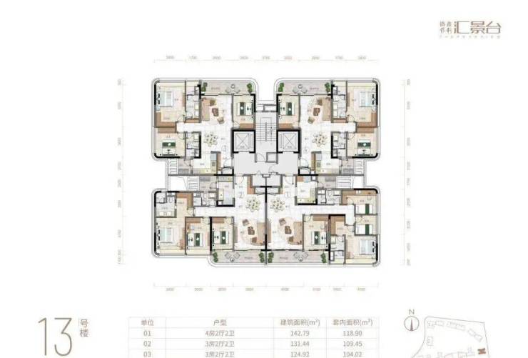 项目由14栋12层小高层组成,产品涵盖123-352㎡三至五房,共8类户型,户型实用率约82-84%