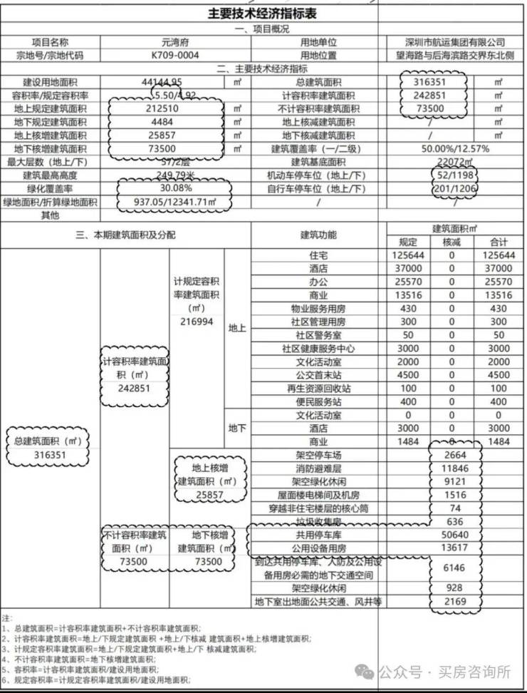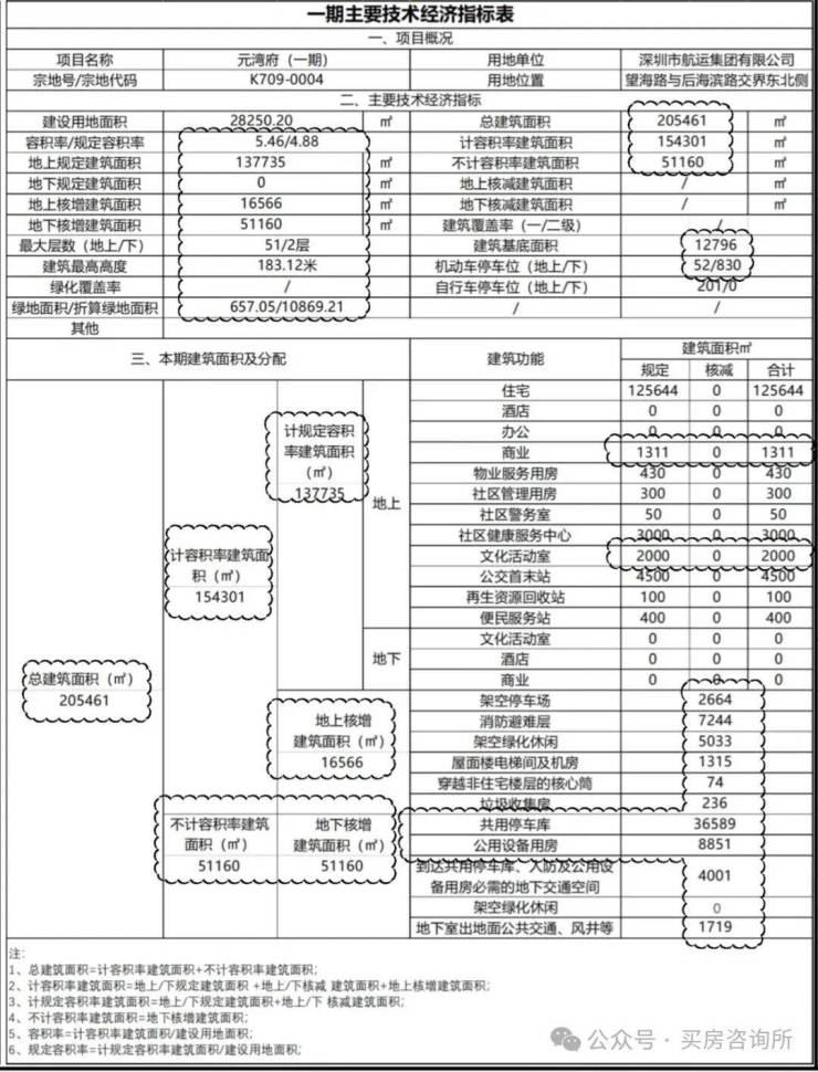 一期指标表修改:总建筑面积由207205平方米调整为205461平方米,计容积率建筑面积由156113平方米调整为154301平方米,容积率由5.53调整为5.46;计规定容积率建筑面积由137577平方米调整为137735平方米,其中商业面积由3153平方米调整为1311平方米,文化活动室由0平方米调整为2000平方米;地上核增建筑面积由18536平方米调整为16566平方米,地下核增建筑面积由51092平方米调整为51160平方米;建筑总高度及层数由54/2层、192.42米调整为51/2层、183.12米;建筑基底面积由11803平方米调整为12796平方米。总指标表相应修改。