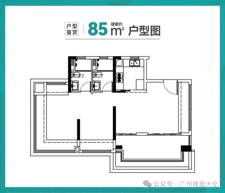 建面约 85㎡这个户型,有两大亮点:其一,是阳台做到约6米长,可以放一张小圆桌,或是瑜伽垫,喝茶、健身,都能观景。