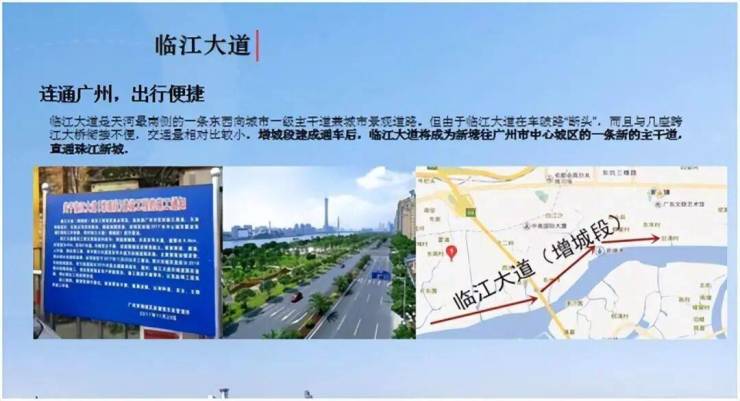 临江大道是目前广州稀缺景观主干道之一,是广州CBD珠江新城的景观展示标杆道路,为推动广州国际金融城开发建设及缓解黄埔大道的交通压力,临江大道将东延至新塘镇,成为广州自东向西的新主干道,项目位于临江大道东端,建成后,从项目出发,30分钟一路直通到珠江新城,实现30分钟天河生活圈