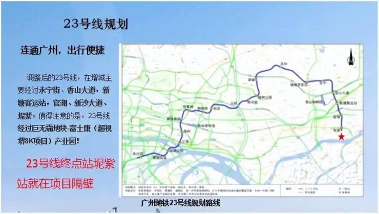 23 号线【坭紫站】(规划中),驾车约8分钟直达新沙地铁站,便捷式连接粤港澳大湾区生活, 项目约一公里处坭紫站,新塘7 轨交汇,实现 1 小时湾区生活圈;
