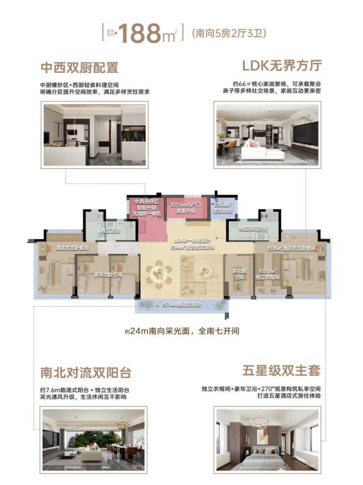 项目总建面约23.1万㎡,容积率2.5,规划13栋住宅。产品涵盖约76-188㎡(均价1.8-2.5万/m²)全南向“新规”三至五房,户户全南向大面宽,全开间采光,采用两梯四户、两梯五户布局,户户带主套,实用率约100%。