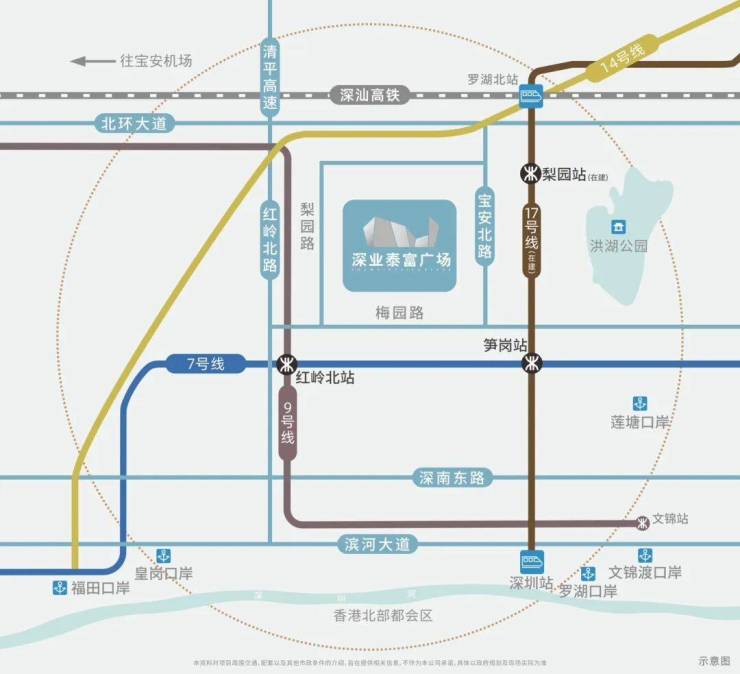 ④全维立体交通 纵横世界脉搏四轨纵横:项目经地下通道直达7/9号线双地铁站,毗邻14、17(在建)号线主轴汇聚:泥岗路、笋岗路、红岭北路、宝安北路、文锦北路等主干道环绕双高铁站:深圳站枢纽、罗湖北站枢纽(在建)在侧,开启非凡商务体验三大口岸:罗湖口岸、文锦渡口岸、莲塘口岸,快速联通深港双城