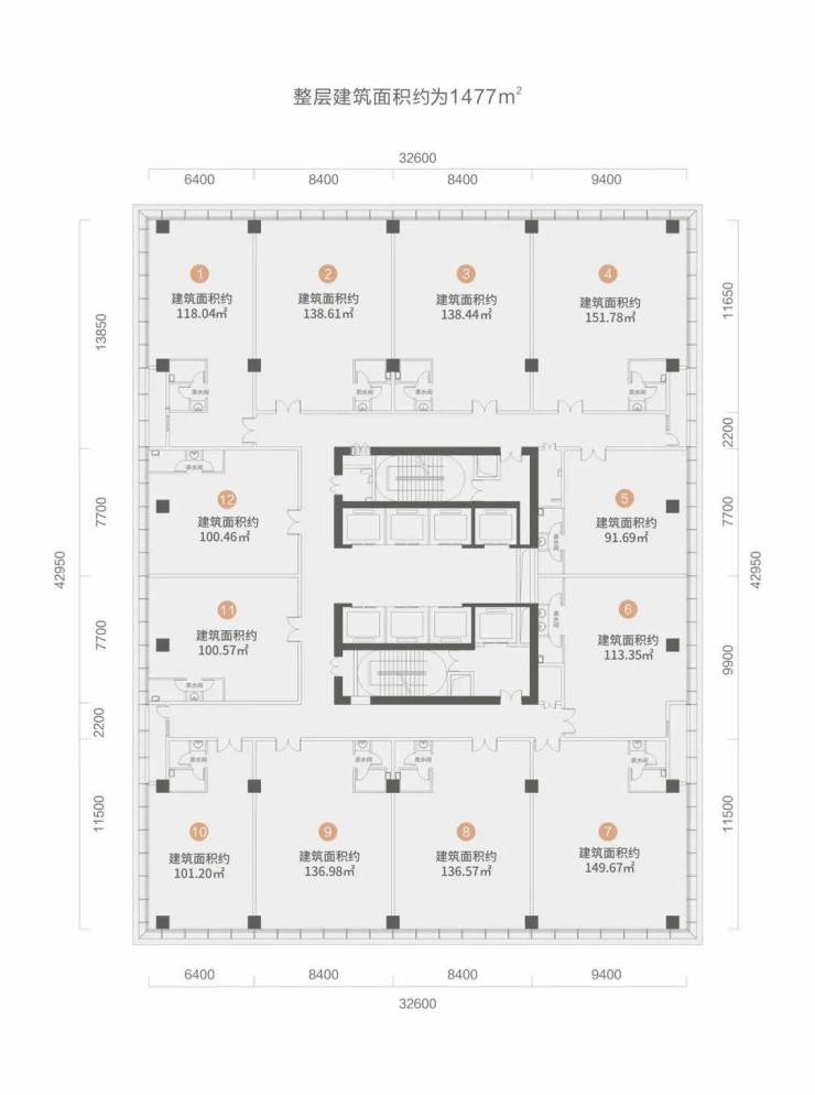 建筑面积:约29000㎡建筑高度:约97.5m标准层面积:约1477㎡户型区间:约92-152㎡标准层高:约3.7m(25F约4.5m)使用率:整层约80%楼板承重:约200KG/㎡大堂高度:约10.5m绿化覆盖率:约30%规划车位:约1300辆(一期办公、公寓、商业公用)深业运营物业管理费:12元/㎡·月产权:40年(2016.8-2056.8)电梯:8部进口日立电梯交楼时间:现楼发售