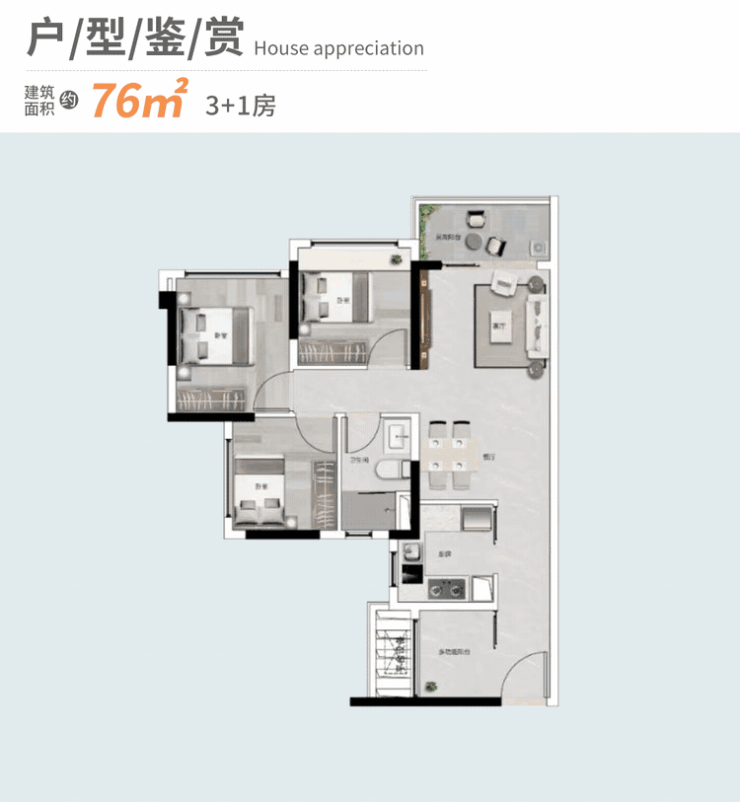 【76㎡3+1房2厅1卫】餐厅、客厅连通布局,低总价晋阶天河;