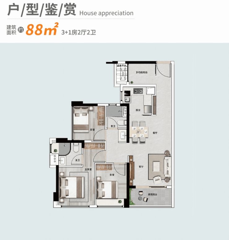 88平3房+1空间,更分为横厅和竖厅设计。