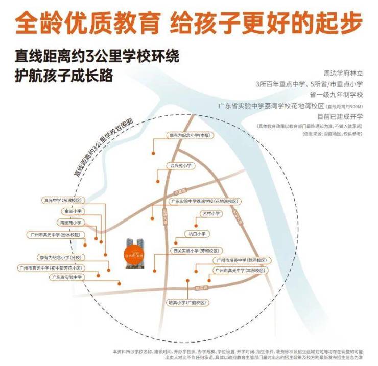 项目配建9班幼儿园,东北侧即广东实验中学荔湾学校,西南侧近康有为纪念小学(在建);荔湾区集团化办学全覆盖,周边有真光、培英、培真等省/市中小学环伺,优质教育丰富。(具体教育政策以教育部门最终通知为准)
