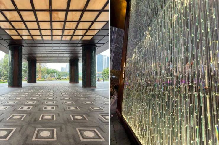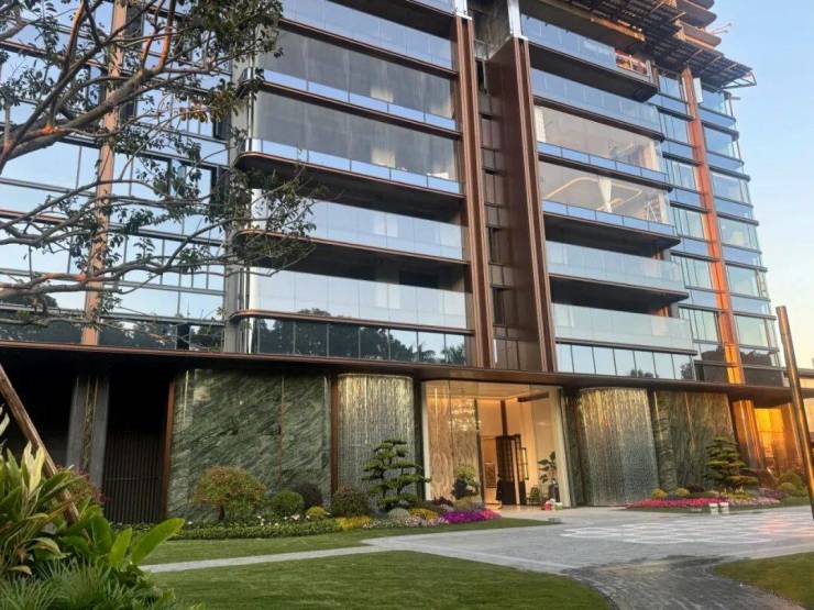 划重点,装修标准超豪华,会所、电梯、墙面等大多是名贵奢石铺设,光是门口的巨大紫薇就价值百万,会所用水景打造的门柱价值千万...处处透着“贵”字。