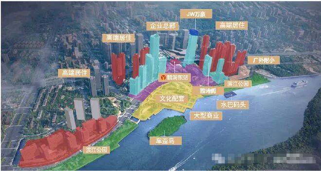 项目紧邻地铁11号线鹤洞东站,直线距离不到200米,且规划中的佛山地铁11号线也将在项目南侧设站,通过广州首条环线11号线,可以快速连接珠江新城等重要区域。此外,项目还引入了“TOD”模式,实现了站城一体化设计,联通城市、车、人和轨道系统,并规划水上巴士服务,进一步提升了出行的便利性。