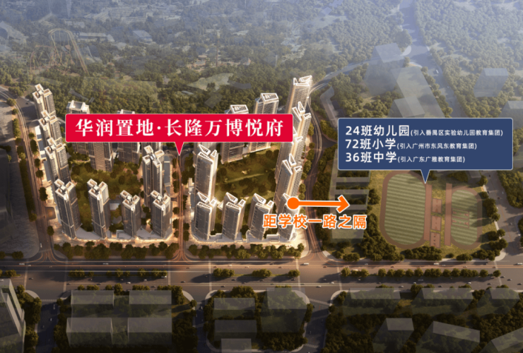 华润置地长隆万博悦府,住宅地块主要分为两期开发,目前一二期均在售,另外还包含了两块商业用地,其中一块配建万象商业,和中小学用地(配建21班幼儿园+72班小学+38班中学),是目前广州在售项目中,为数不多集学铁商的项目之一;