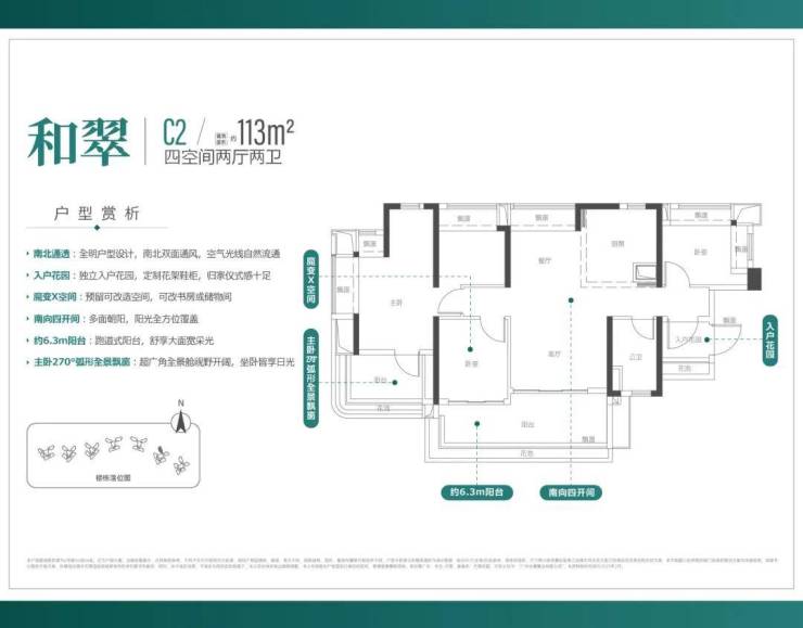 约113㎡四房两厅两卫户型,南北双面通风,搭配约6.3米大阳台、同样四面采光全明设计,主卧270度弧形全景飘窗,简直是“日不落户型”。