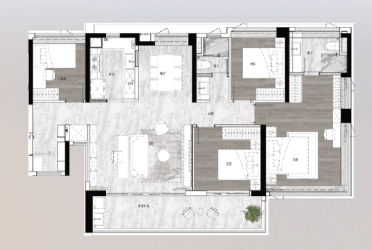 建筑面积105㎡的四房两厅两卫,四开间朝南,LDKB一体化设计,5.9m开间巨幕客厅,主卧270°全景飘窗。