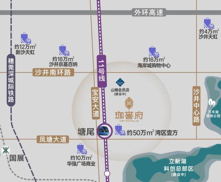 鸿荣源斥资约 250 亿打造约 50 万㎡“湾区壹方” 城市级购物中心,规模与档次拉满;宝安首家山姆会员店将于 2025 年底开业,生鲜、家居、零食一站式采购;周边还有约 10 万㎡“熊出没” 主题华强广场、18 万㎡海岸城商业已开业,三大商业体共筑百亿超级商圈,吃喝玩乐购全满足,下楼即享繁华生活。