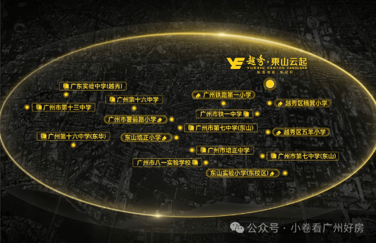 项目本身所在的越秀东山,也是广州名校遍布的片区,对口的杨箕小学,也已纳入铁一教育集团。2024年越秀招生划分范围,杨箕小学在第五分组,未来有机会进入省实、铁一、七中、16中等强校。