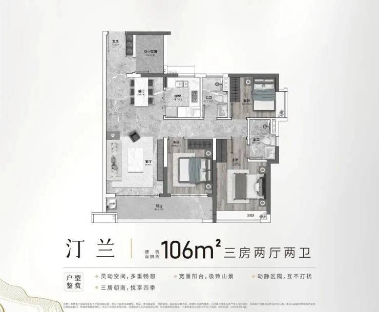 比如91平的四开间朝南+U型厨房;106平三房及四房都有大阳台,整体采光和实用空间都算出色。