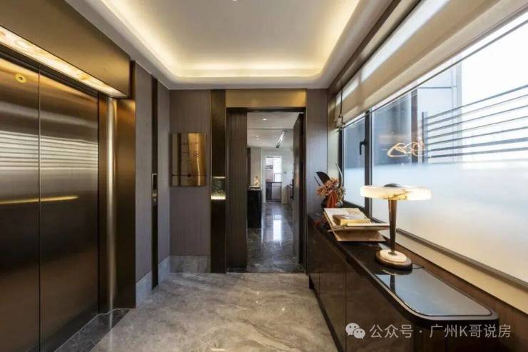 电梯出来的过渡空间,可作为“前庭”,展示个人喜好,也可做收纳空间,装下雨伞钥匙高尔夫球杆等,安放生活的琐碎。