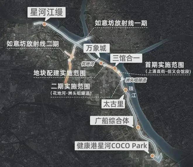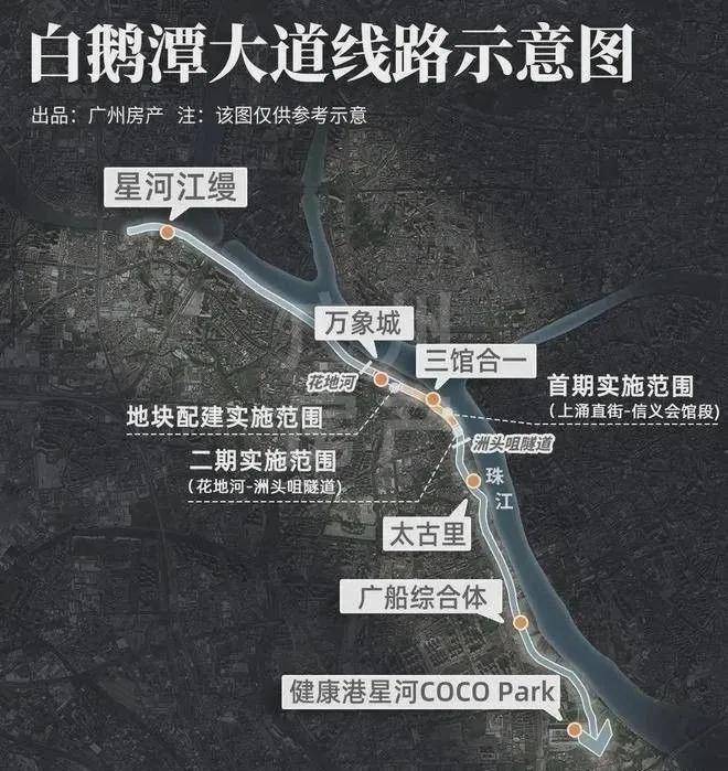 目前,白鹅潭大道星河江缦段已建成通车,花地河-洲头咀隧道段、上涌直街-信义会馆段均已经动工。