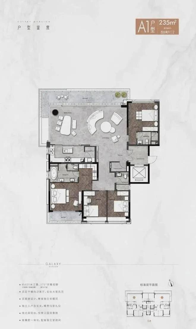 星河江缦全盘仅有342套单位,有且仅有四房起大平层,全部是双主套设计,追求的是私密尊贵。