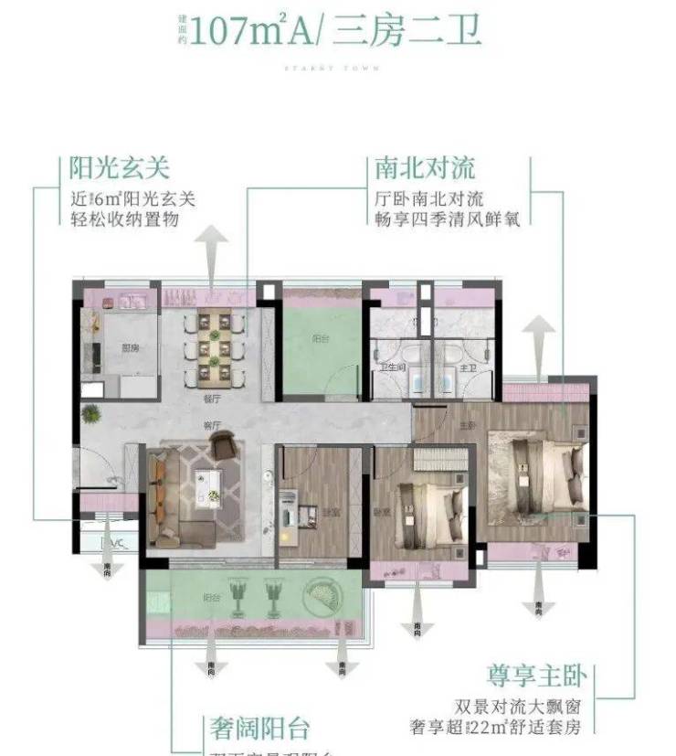 全南向:三卧室朝南,超11米景观线