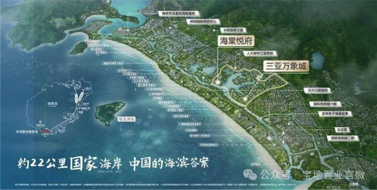 ——国家海岸 汇聚全球度假资源——三亚海棠湾被定位为“国家海岸”,作为世界级的旅游度假区和度假天堂,承载国家热带滨海旅游品牌形象。规划"一点·一带·三区",约22公里黄金海岸线坐拥千亿级的娱乐、休闲、康养、购物、教育等资源配套。