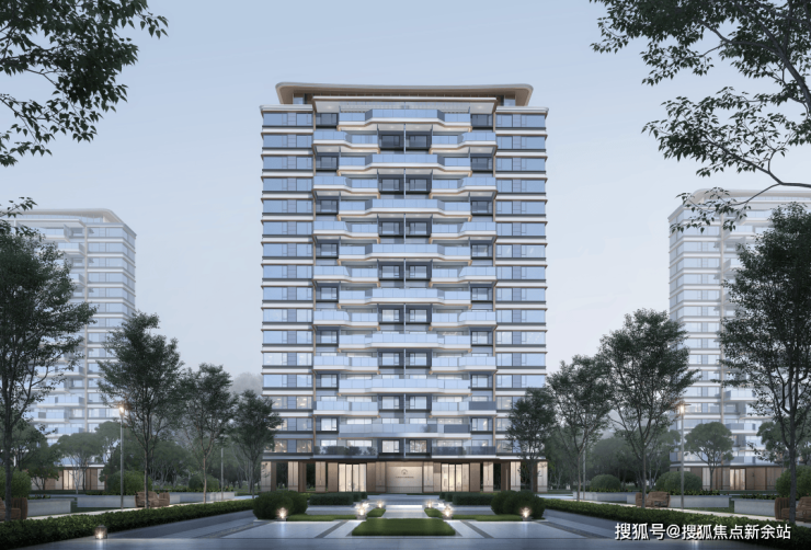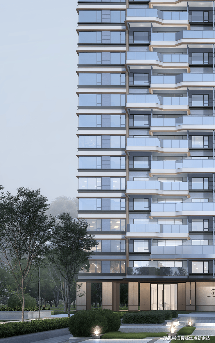 楼栋立面弧度设计取意岐江波纹,行云流水,搭配LOW-E晶钻玻璃和香槟金线条,阳光下如“鎏金烁银”,夜幕中则璀璨流光。