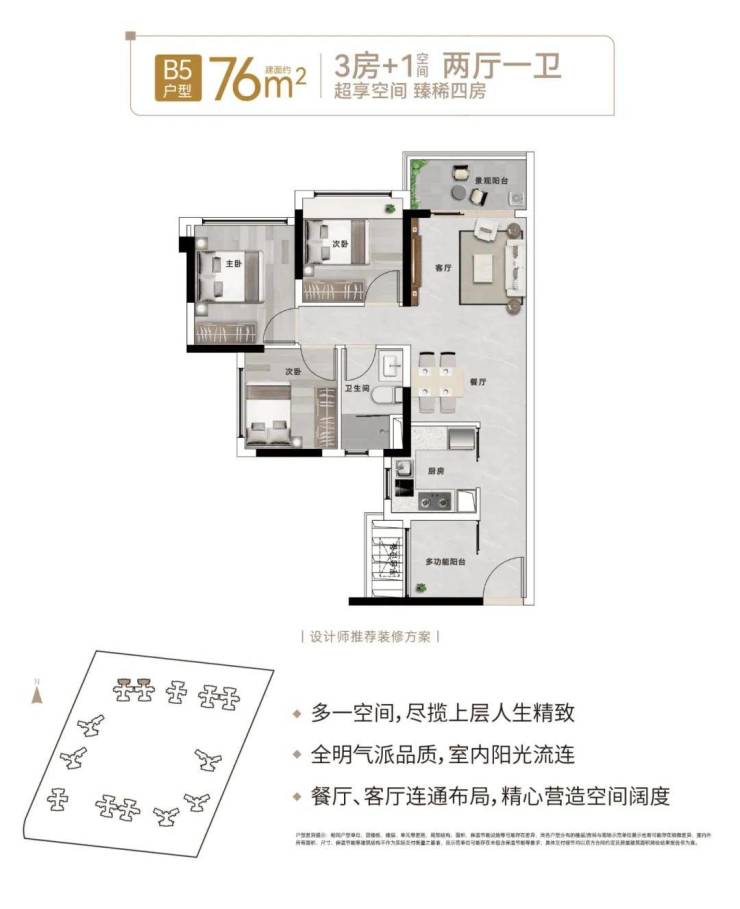 建面约76㎡3房+1空间,拥有观景阳台让孩子在自然氛围中学习、放松双眼;+1 可变空间能切换为书房或休闲区;三面采光保障孩子学习环境明亮护眼;客餐无界方便亲子互动和孩子社交。