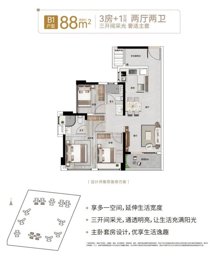 建面约88m²的3房+1空间,南向竖厅采用3开间布局,客餐空间一体化,保证屋内光线充足,公共空间尺度大幅拓展,各类场景随心切换。还有横厅户型可选,尊享约11米南向大开间,南北通透,直面中央园林美景。