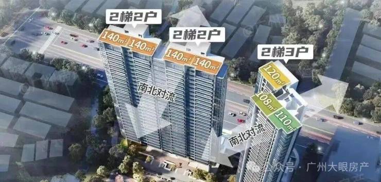 2号楼为两梯三户,分别有三种户型,108/110方做三房,120可做四房。3栋(3A/3B)则是140方可做四房户型,板楼设计,两梯两户,是楼盘的主打户型,货量最多。