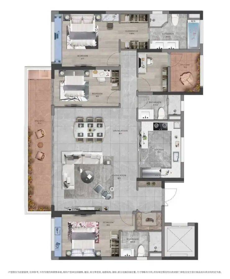 135㎡四房两厅两卫,约7m观景阳台,宽阔视野收藏中轴绿廊。