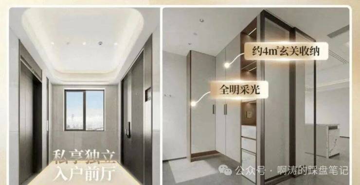 除了专属独立电梯厅,室内还打造有约4㎡的入户鞋帽间,形成“内外双玄关”的设计。