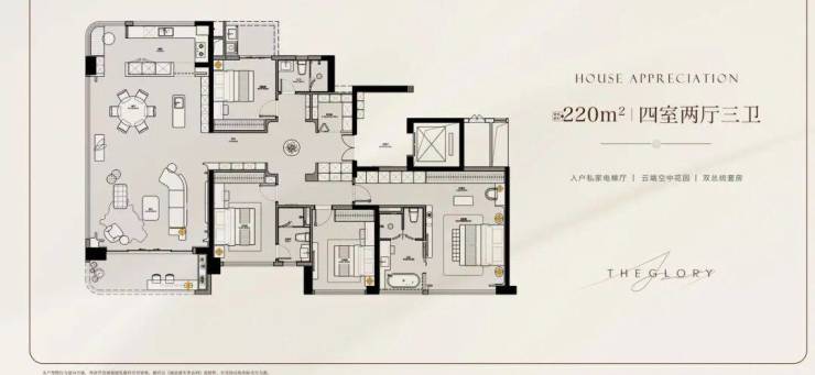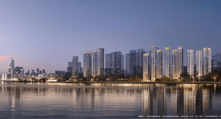 项目外立面以香槟金铝板与晶钻叠层玻璃构筑“珠江之镜”,并以零涂料外立面刷新城市颜值上限。园林方面,330米中轴园林贯通南北双园,设计上以“礼序对仗”为核心,将中国传统建筑美学与现代都市生活完美融合,打造了一条充满仪式感的归家动线。