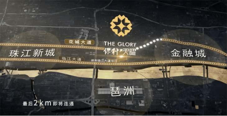 全维路网—临江大道、花城大道、过江隧道连接珠金琶;便捷地铁—员村站上盖,5号线三站珠江新城站,11号线1站即达琶洲;