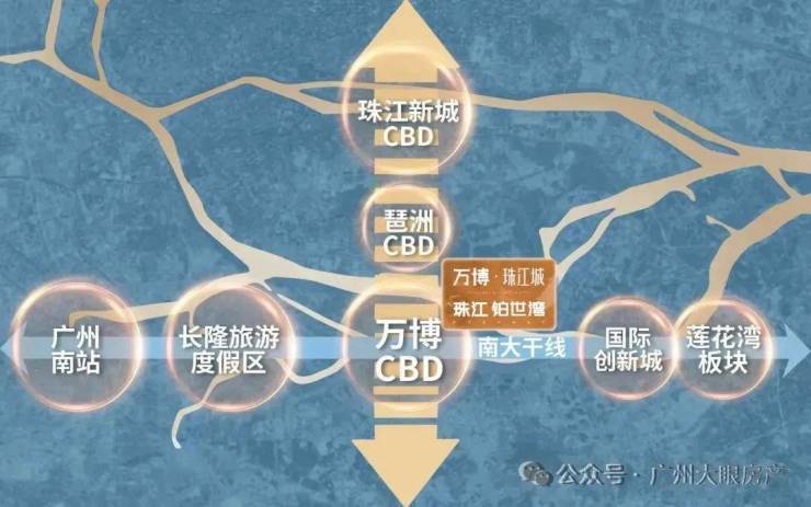 项目地处广州城市中轴&南大干线经济带双中轴交汇点——万博核心,南北CBD塔尖资源一脉尽享。