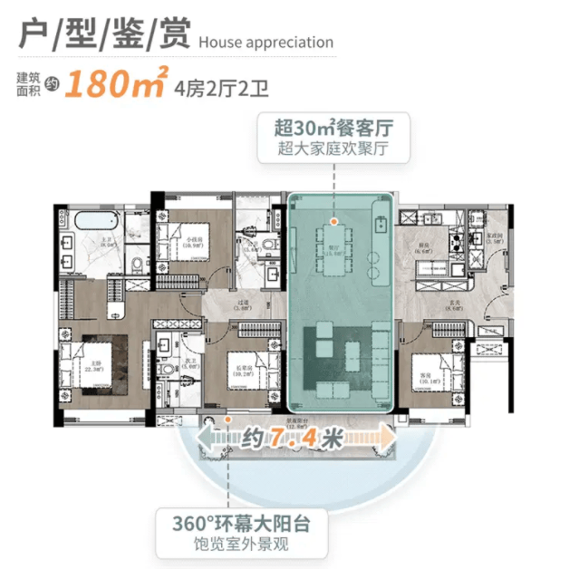 180㎡进阶改善户型(B/E栋):采用罕见的双主套设计,两个主卧均带独立卫浴与步入式衣帽间,私密性极佳。另设专属家政区与多功能房,可灵活改造为书房、儿童活动室或收藏空间,实用率高达86%,细节之处尽显人性化考量。