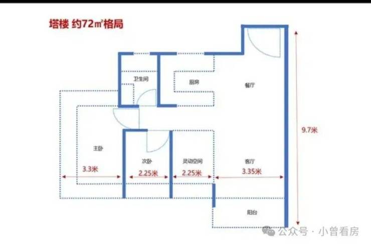 72 平方米三房为塔楼户型,2 梯 5 户设计,通过高使用率规划让空间紧凑实用,每个功能区都能充分利用,总价约 360 万起,适合小家庭入手。