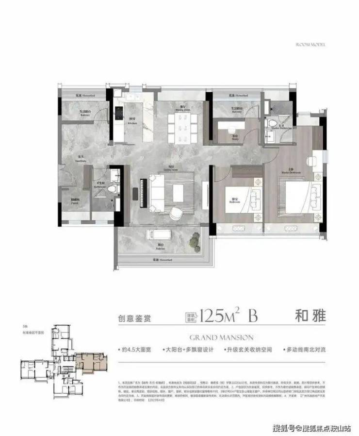 例如面宽,整个户型拉大了南向开间面,南北对流的同时,实现4.5面的南向面宽。