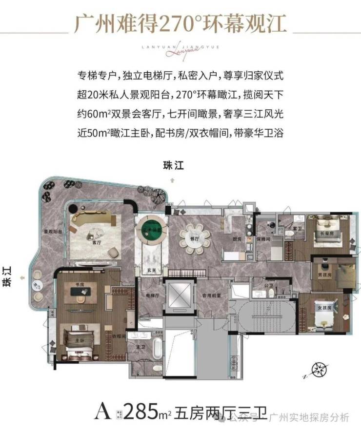 285㎡五房:270°环幕江景阳台,约60㎡双景会客厅,主卧配书房及双衣帽间。